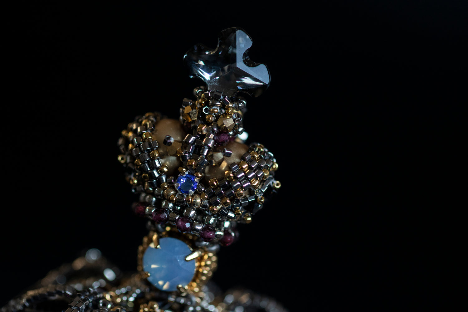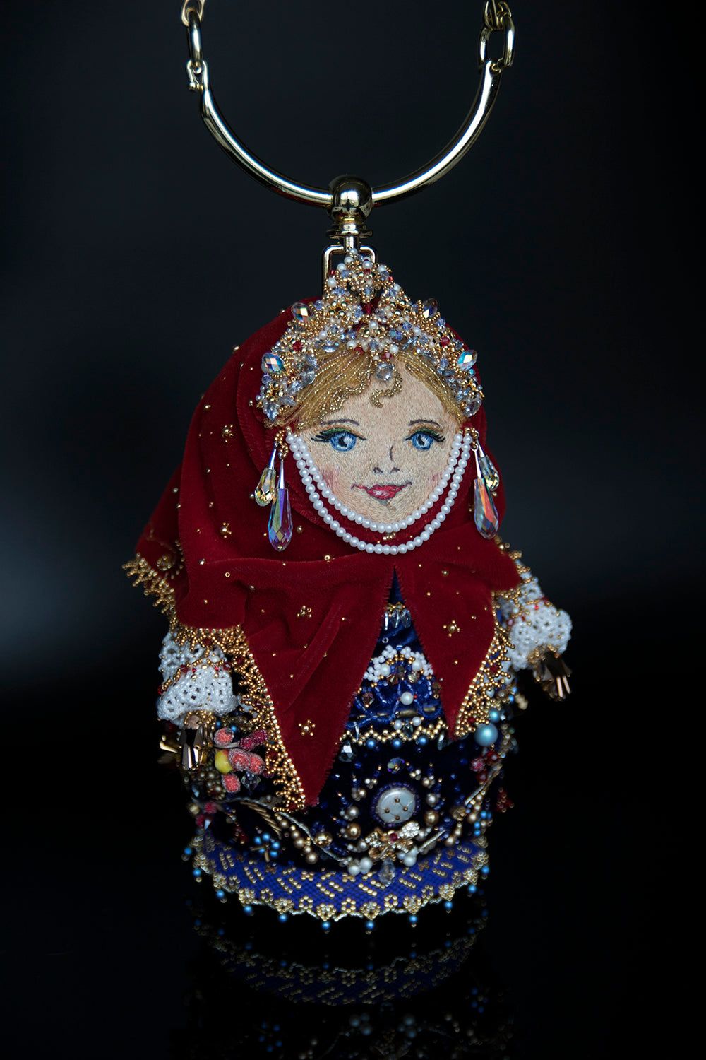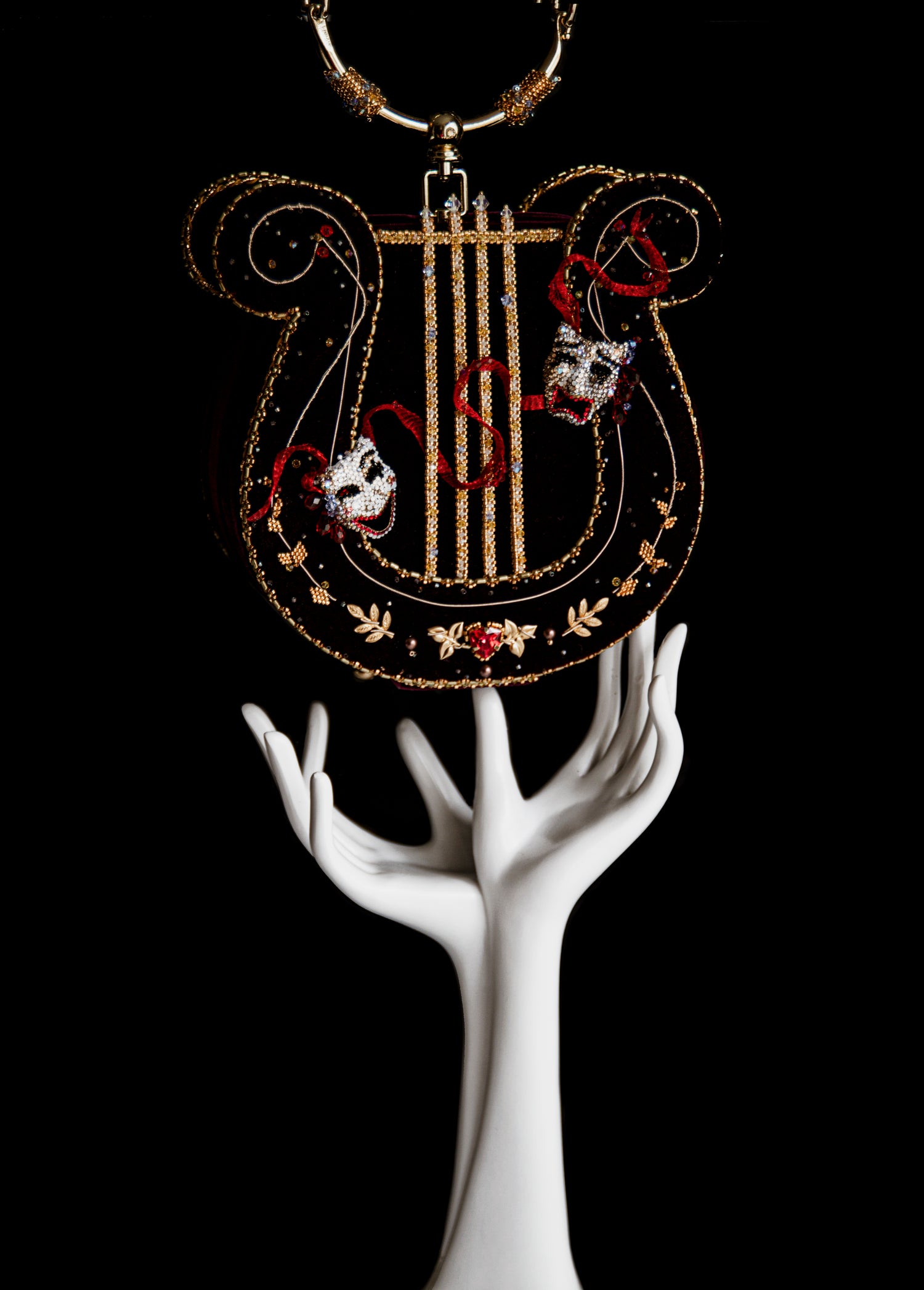 A blooming apple-shaped art clutch embroidered with pearls, bees, and golden vines — a tribute to nature and innocence.