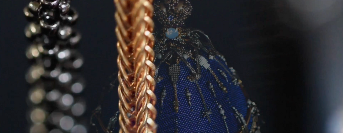 A blooming apple-shaped art clutch embroidered with pearls, bees, and golden vines — a tribute to nature and innocence.