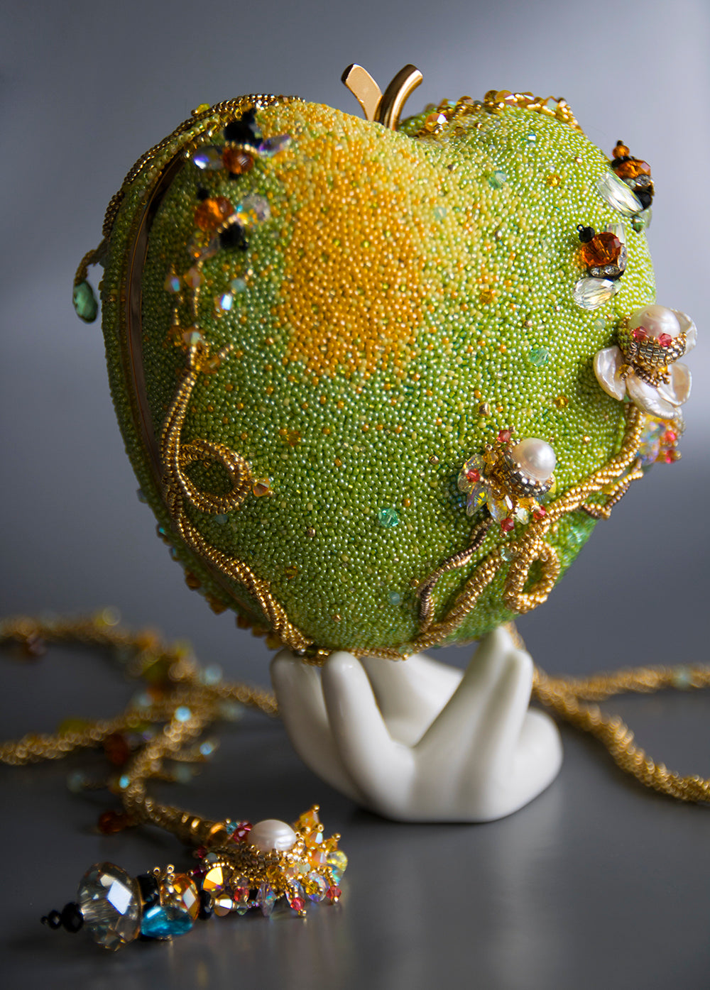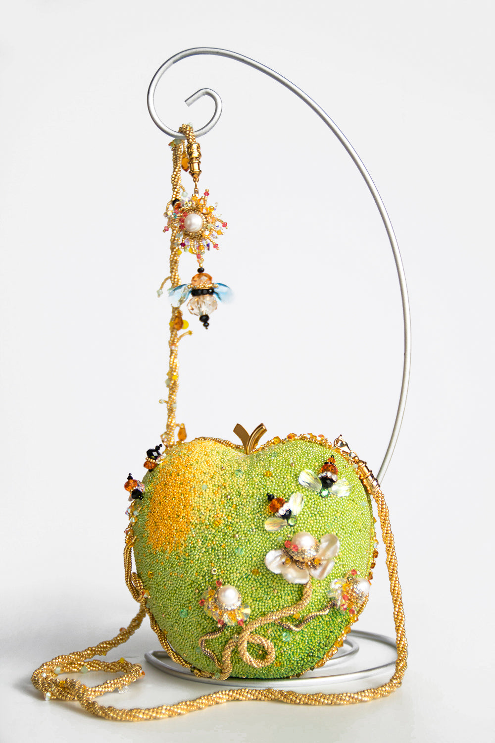 Shaped like a blooming apple, this sculptural clutch captures the stillness of paradise before the fall — a suspended moment of innocence embroidered in pearls, glass, and golden vines.