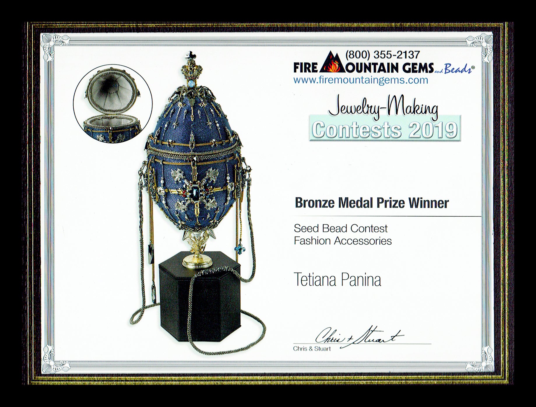"Tsesarevich" was awarded the Bronze Medal Prize at the Fire Mountain Gems Jewelry-Making Contest 2019 in the Seed Bead Contest — Fashion Accessories category, recognizing its excellence as a work of wearable art.
